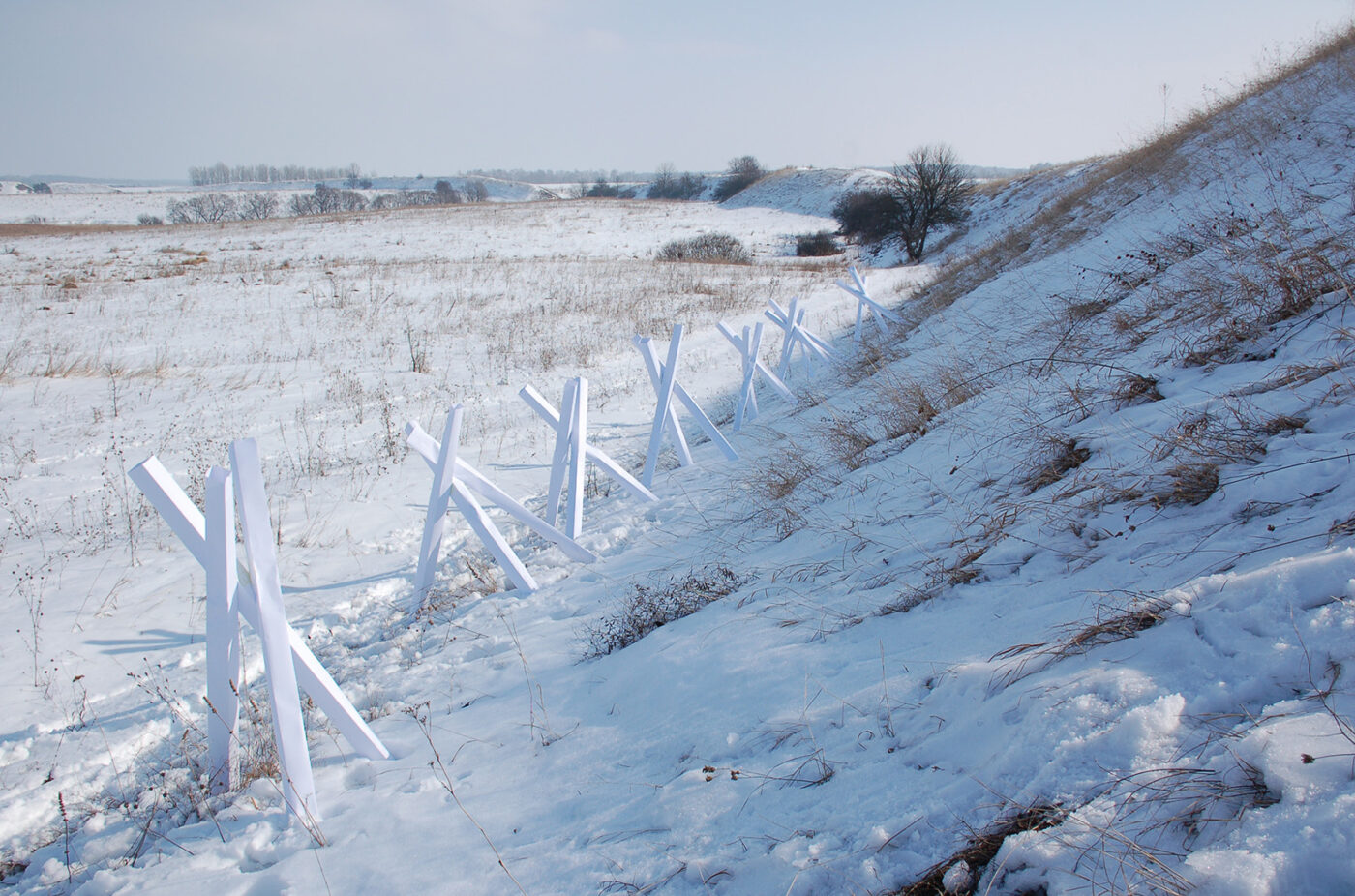 I made these large paper sculptures in the form of anti-tank hedgehogs and installed them in a snowy landscape. I played with the contrast between the fragility of paper and the function associated with this form. Since 2014, when the war actually started, anti-tank hedgehogs have become fully integrated into Ukrainian reality. Rendering them in paper speaks to how vulnerable we are, how our state of mind during the war cannot be defended with anything like hedgehogs because living under war conditions is brutal.